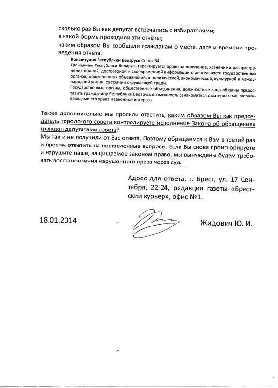 26 декабря письмо председателю горсовета депутатов отправили повторно, где, кроме дублирования интересующих вопросов, был задан еще один. Геннадия Мосько спросили о том, как он контролирует исполнение закона об обращениях граждан депутатами совета. Но и на этот раз ответа не последовало.