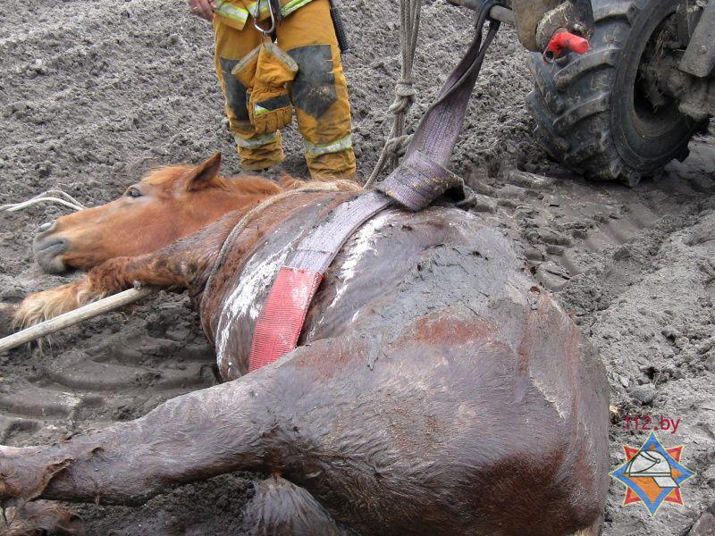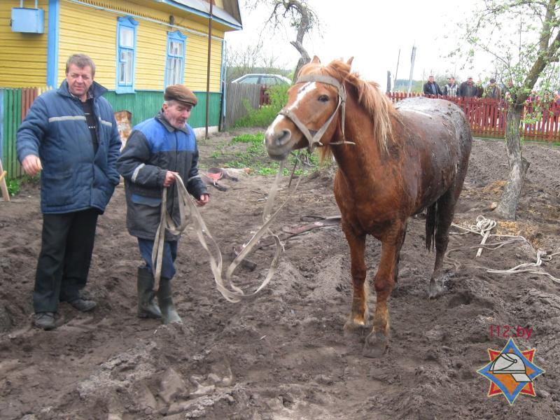 Спасатели обвязали лошадь рукавами, а затем при помощи фронтального погрузчика подняли животное на поверхность, сообщает Брестское областное управление МЧС.