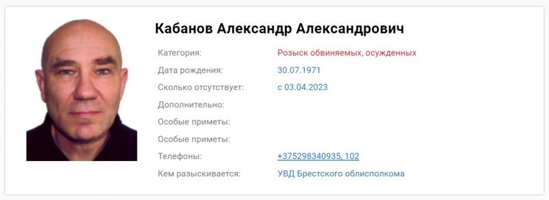 Александра Кабанова разыскивает УВД Брестского облисполкома. В ориентировке указывается, что его ищут в качестве «обвиняемого/осужденного».