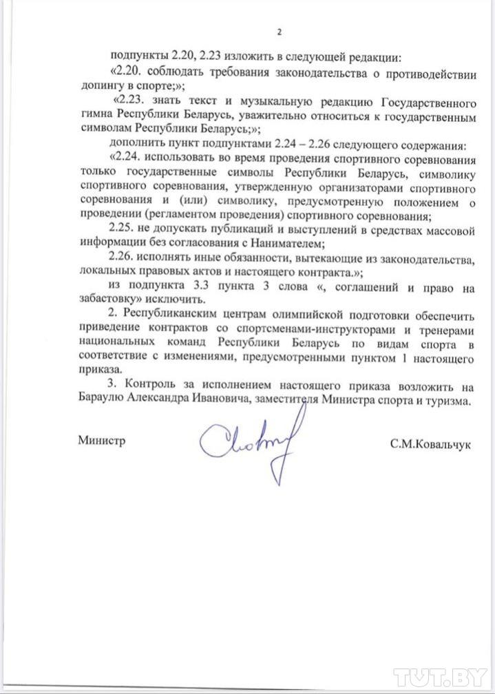 Белорусских спортсменов просят подписать дополнительные соглашения к контрактам, согласно которым они, в частности, обязаны наизусть знать гимн Беларуси, могут использовать только государственную символику, не имеют права давать комментарии СМИ и делать любые публикации без разрешения нанимателя. Приказ, подписанный 18 сентября министром спорта Сергеем Ковальчуком, прислал в редакцию TUT.BY читатель.