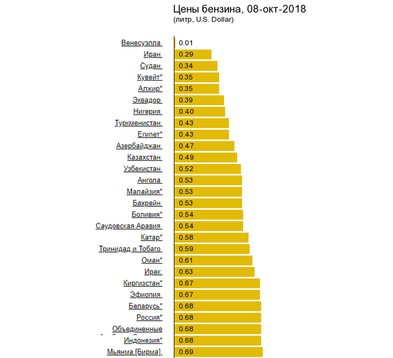 Самое дешевое топливо — в Венесуэле. Там литр бензина стоит всего цент. Также в тройке наиболее дешевых в этом отношении стран — Иран (29 центов) и Судан (34 цента).
