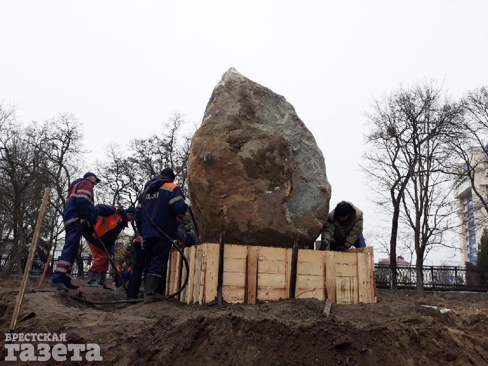 Установкой валуна вечером 13 марта занимались сотрудники ДЭП. Он разместился в центре брестского Городского сада на небольшой насыпи.