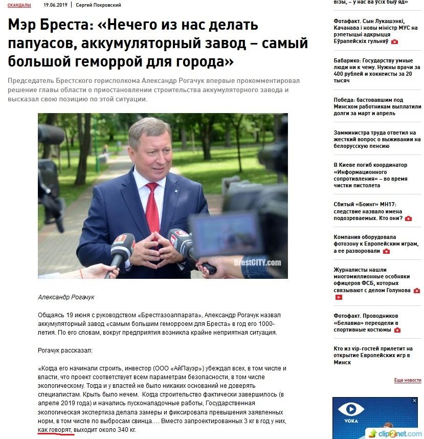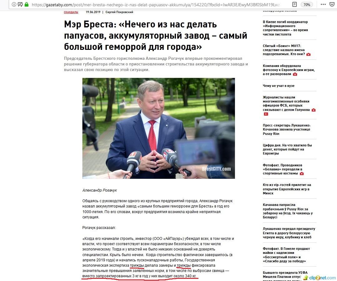 «Мэр Бреста: «Нечего из нас делать папуасов, аккумуляторный завод — самый большой геморрой для города» — с таким заголовком вечером 19 июня вышел материал на сайте «Салiдарнасцi». Заголовок громкий сам по себе, но «бомба» оказалась в тексте. «Салiдарнасць» написала, что Александр Рогачук во время визита на одно из брестских предприятий сказал, что «государственная экологическая экспертиза трижды делала замеры и трижды фиксировала значительные превышения заявленных норм, в том числе по выбросам свинца — вместо запроектированных 3 кг в год у них выходит около 340 кг».