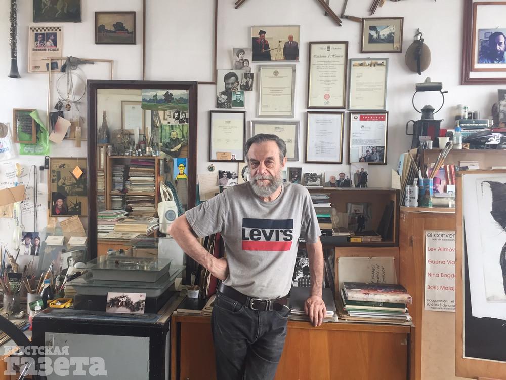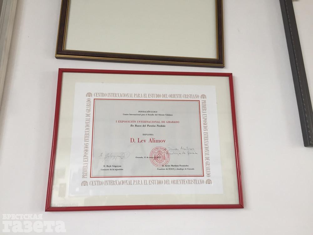 Лев Борисович назначил мне встречу в своей мастерской в многоэтажке на брестской набережной. Арендуемая мансарда с видом на Мухавец стала творческой базой мастера еще 20 лет назад. В центре – «кормилец» – офортный станок мастера. Алимов убежден, что у художника должна быть своя мастерская, а тот, кто рисует на кухне, занимается, скорее, хобби, а не искусством. Приятным музыкальным фоном для нашего разговора послужили композиции американского певца Фрэнка Синатры.