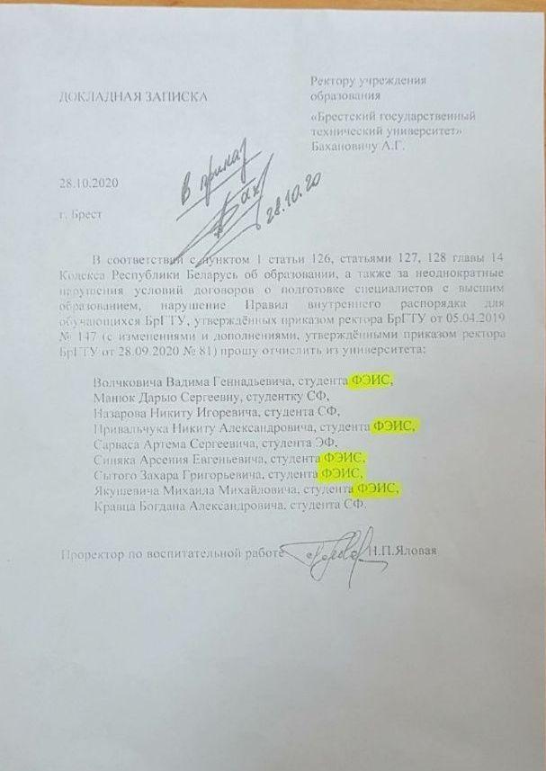 В редакцию TUT.BY попала фотография докладной на имя ректора Брестского государственного технического университета. Документ подписан проректором БрГТУ по воспитательной работе Натальей Яловой. Она просит отчислить из университета девять студентов в связи с «неоднократным нарушением условий договоров о подготовке специалистов с высшим образованием, нарушением Правил внутреннего распорядка для обучающихся БрГТУ».
