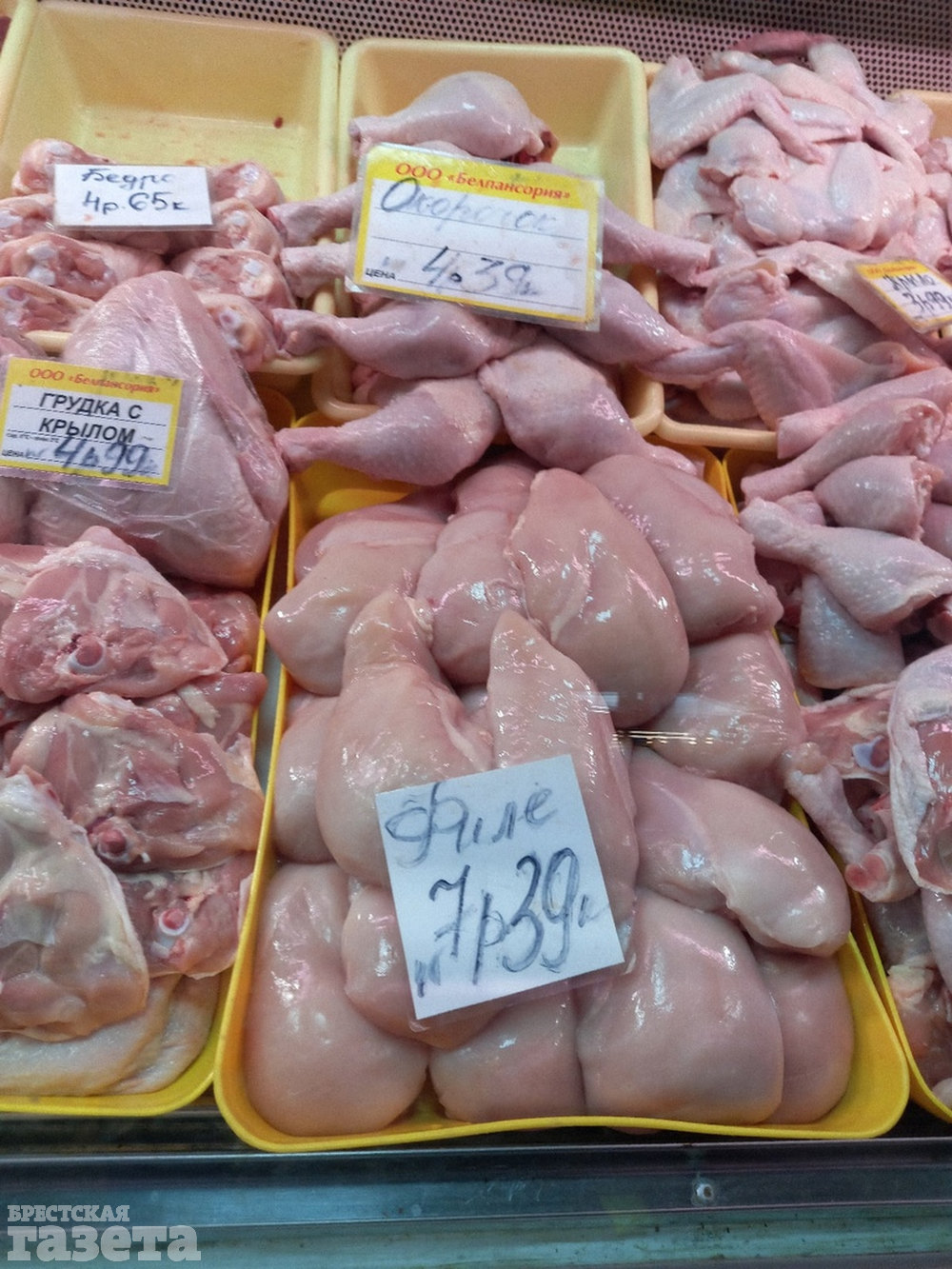 Еще недавно брестчане негодовали, почему в магазинах резко подскочили цены на куриное филе. «Брестский рынок» решил пока держать цены в узде. Филе здесь, как и прежде, стоит в районе 7 рублей за килограмм.