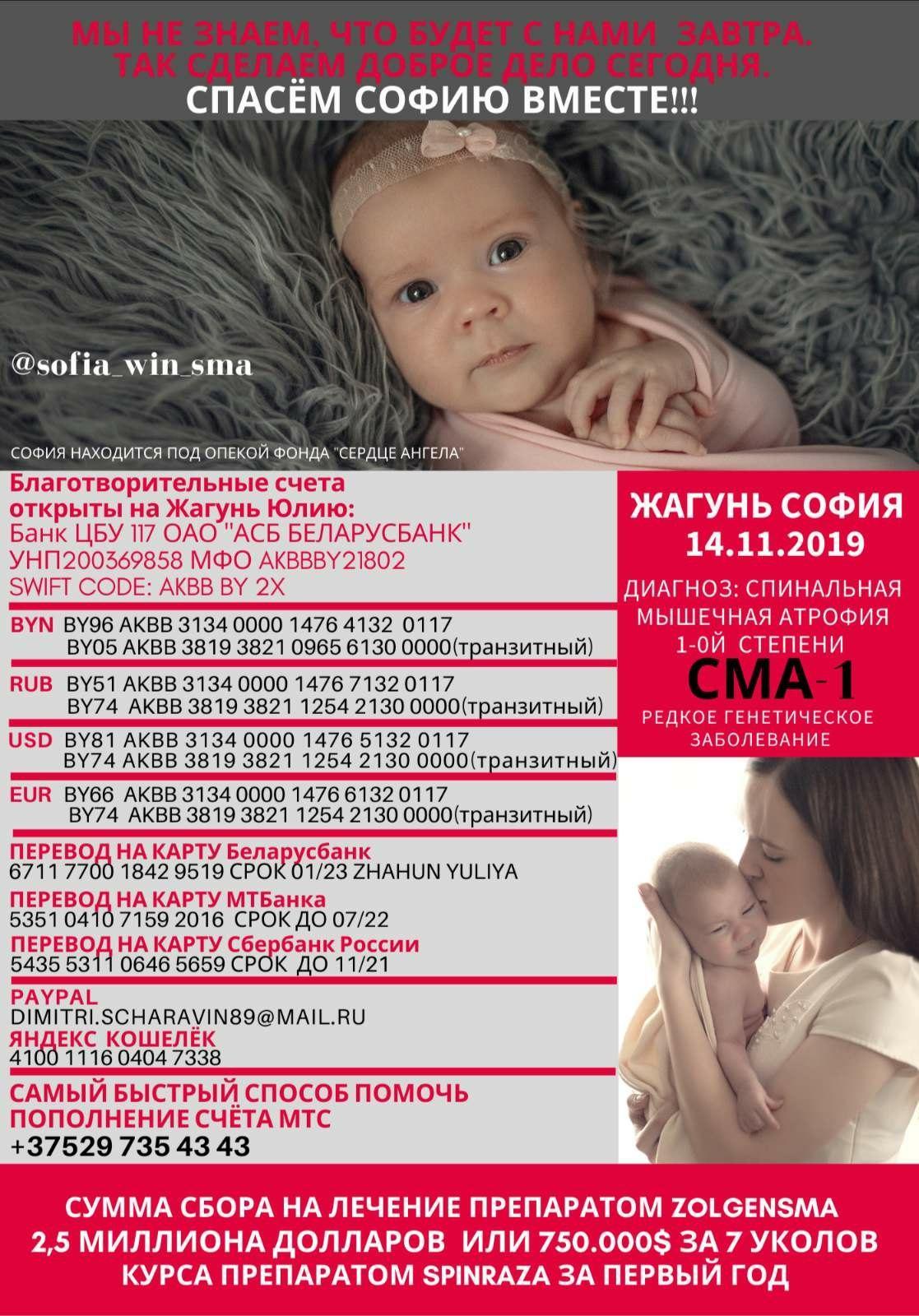 София Жагунь появилась на свет 14 ноября 2019 года. Через месяц у девочки начались проблемы со здоровьем, а 16 января врачи поставили ей страшный диагноз – спинальная мышечная атрофия 1 типа. Это редкое генетическое заболевание. Дети с такой болезнью без лечения не доживают до двух лет: перестают работать мышцы рук, ног, ребенок теряет способность глотать, а в последствии – и дышать. В Беларуси эту болезнь не лечат.