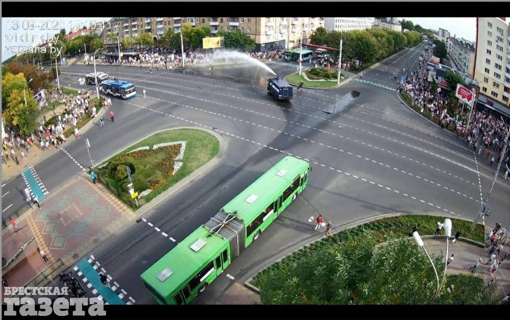 «Сегодня в Бресте около 16.50 было заблокировано движение транспортных средств на перекрестке проспекта Машерова — бульвара Космонавтов. Около тысячи человек в центре перекрестка водили хороводы, пели песни и выкрикивали различные лозунги. Своими действиями участники несанкционированного массового мероприятия блокировали движение общественного транспорта, создали реальную угрозу безопасности дорожного движения другим его участникам. С целью восстановления нормальной жизнедеятельности граждан и обеспечения безопасности дорожного движения был использован водомет», — пояснили в МВД.
