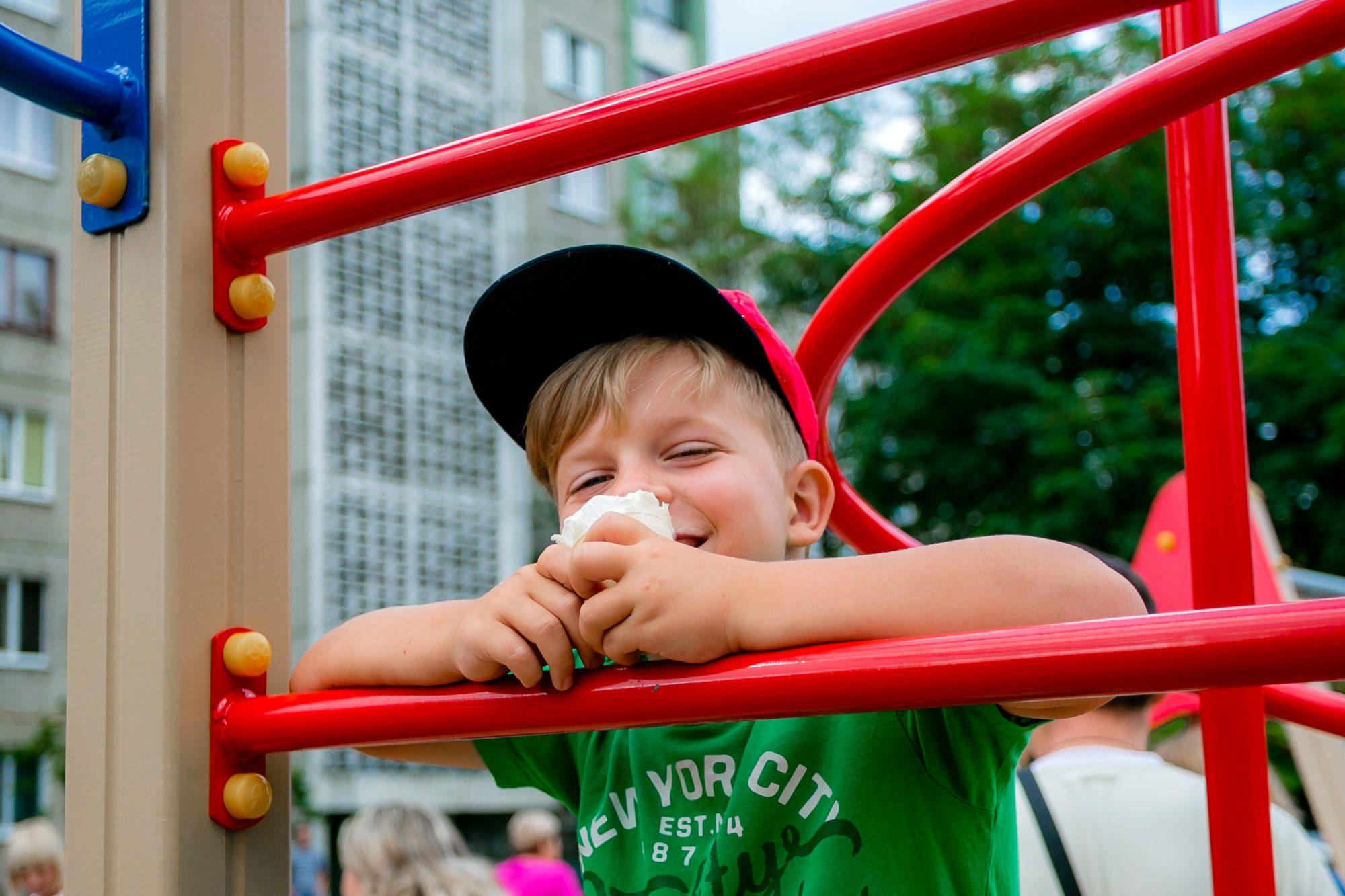 Для спортивных игр и тренировок установили рукоход и шест, а для малышей предусмотрена альпинистская стенка. Рядом с комплексом поставили двойные качели.