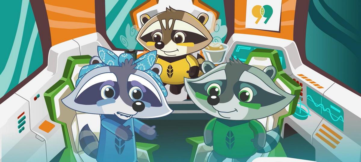 В «Команде 99» – желтый енот Лимон (он символизирует пластиковые отходы), зеленый енот Киви (символизирует отходы бумаги) и девочка-енот Ежевика – олицетворяет отходы стекла.