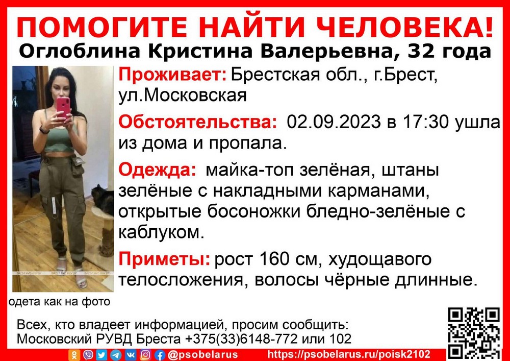 Московским РУВД устанавливается местонахождение без вести пропавшей 32-летней жительницы Бреста Кристины Валерьевны Оглобленой.