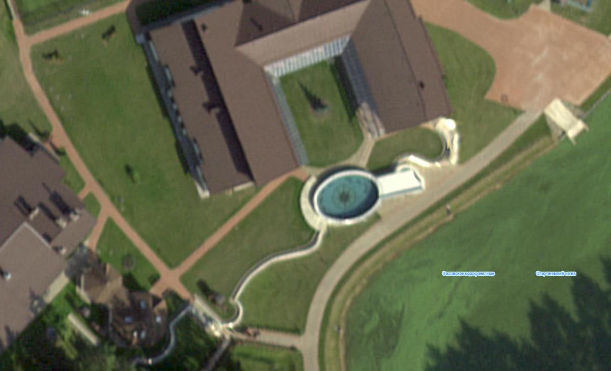 Так, в Дроздах, кроме спортивных и вертолетной площадок, можно рассмотреть и благоустройство. У дома что-то похожее на фонтан, а рядом с другим участком есть даже детская площадка.