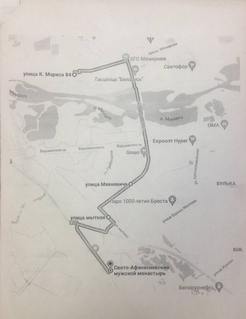 Маршрут следования: Симеоновский кафедральный собор (улица Карла Маркса, 84) — проспект Машерова — Бульвар Шевченко — мост через реку Муховец — улица Махновича — улица Мытная — автодорога Р17 — улица Свято-Афанасьевская — Афанасьевский мужской монастырь.