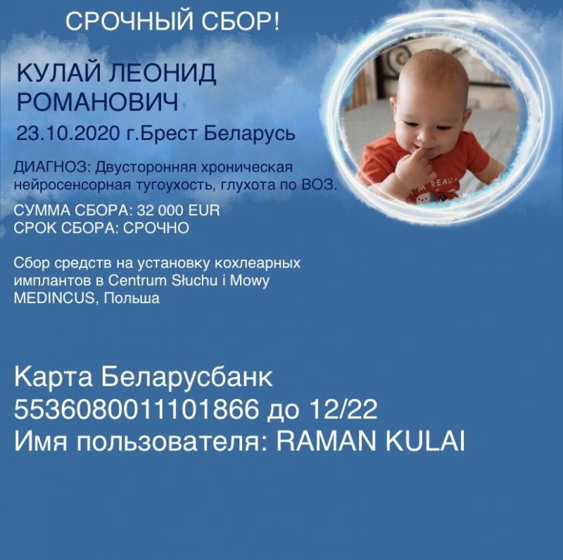 В Бресте 31 марта стартует благотворительный марафон БРСМ «Все краски жизни для тебя». Он пройдет в поддержку полуторагодовалого Леонида Кулая, которому врачи диагностировали двустороннюю хроническую нейросенсорную тугоухость и глухоту. Об этом сообщает БелТА.