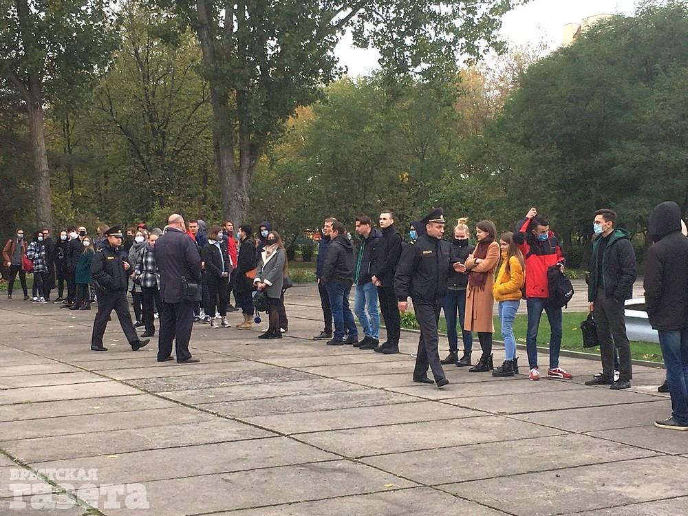 Студенты БрГТУ начали собираться перед университетом около часа дня. За несколько минут у фонтана выстроилось примерно 40 человек.