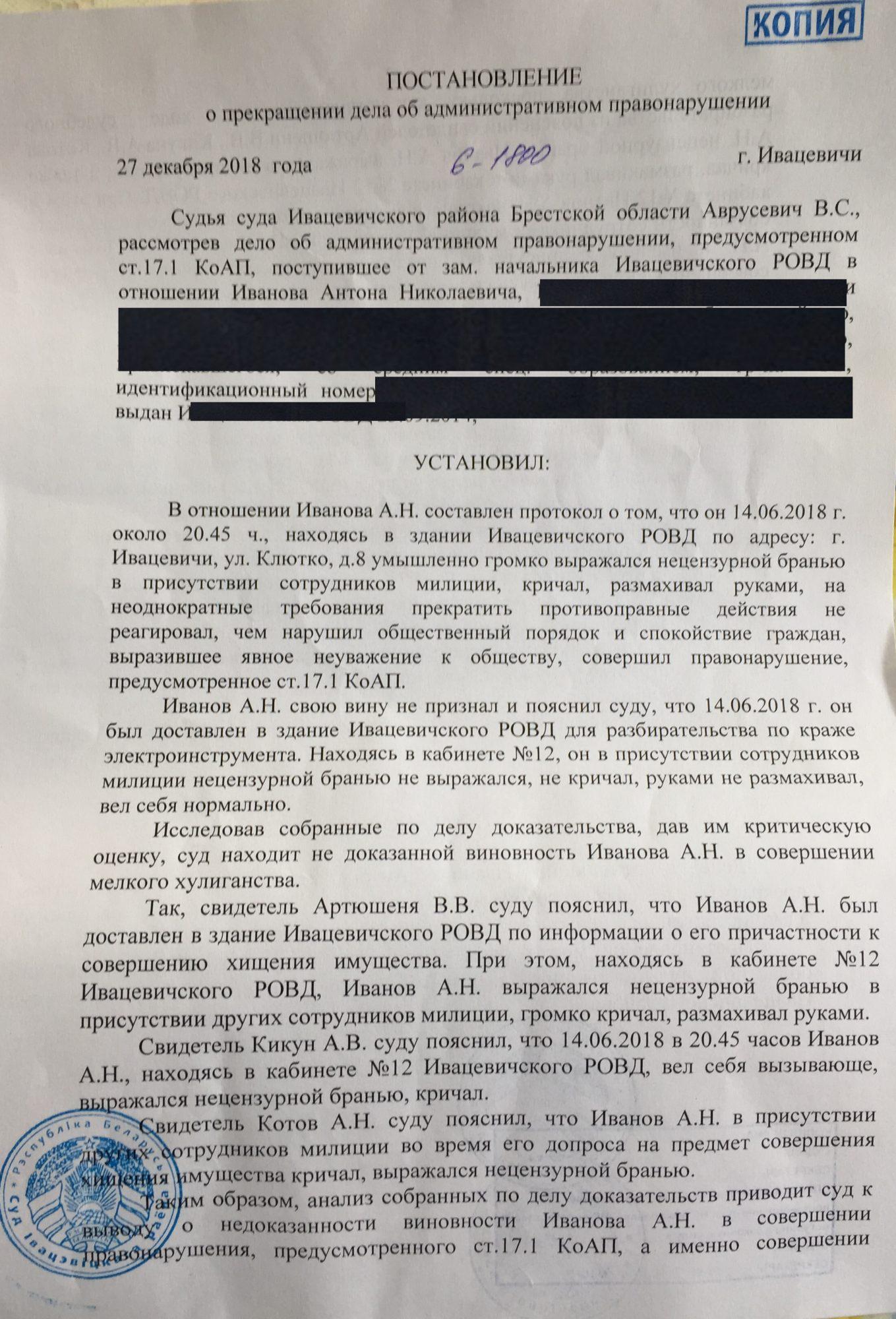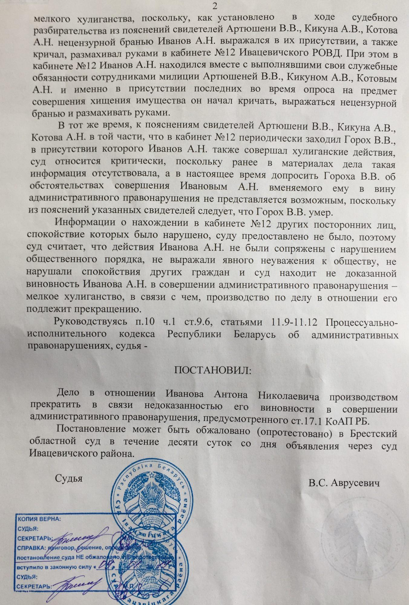 В суде против Антона Иванова свидетельствовали милиционеры Ивацевичского РОВД Артюшеня, Кикун и Котов. Милиционеры утверждали, что Антон Иванов в здании Ивацевичского РОВД намеренно громко выражался нецензурной бранью в присутствии сотрудников милиции, кричал, размахивал руками, на неоднократные требования прекратить противоправные действия не реагировал, чем нарушил общественный порядок и спокойствие граждан, совершил правонарушение, предусмотренное ст. 17.1 КоАП.