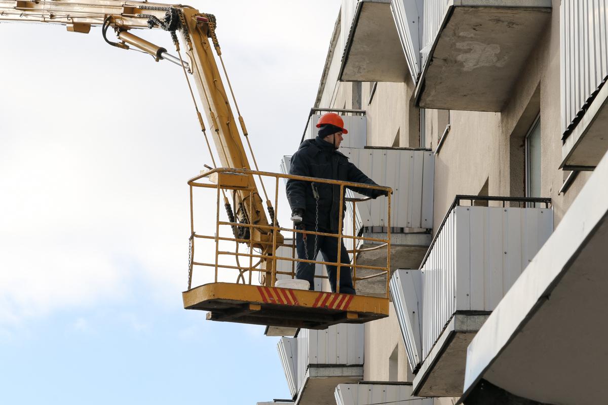 — К чему-то готовимся, а к чему, я не знаю, — говорит мужчина, который заделывает щели в фасаде у бокового входа в кинотеатр «Октябрь».