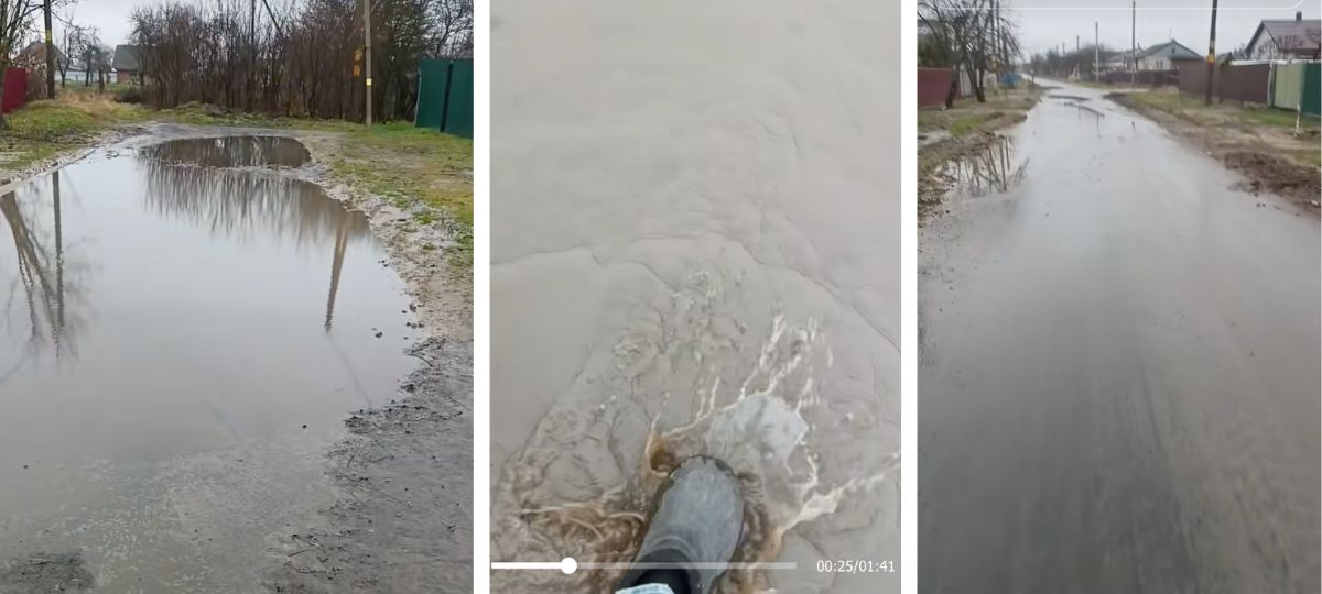 По словам автора видео, асфальт положили в сентябре. Но, как он утверждает, на этом работа и закончилась. Грунт не выровняли, подсыпку не сделали, водоотвод не предусмотрели. В итоге после дождей вода никуда не уходит и скапливается прямо на проезжей части.