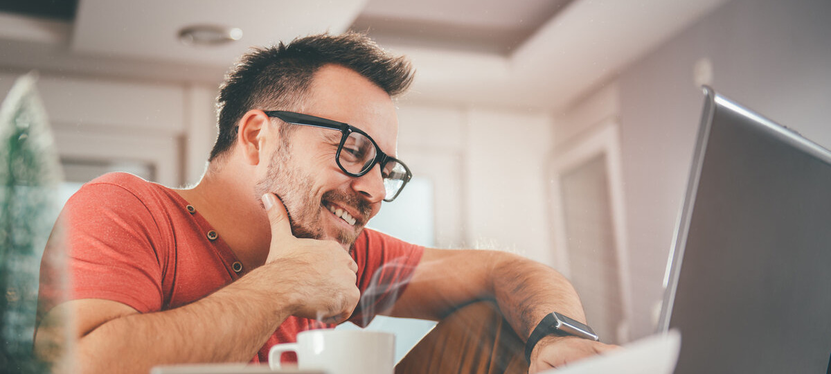 Мужчина смотрит в компьютер и улыбается