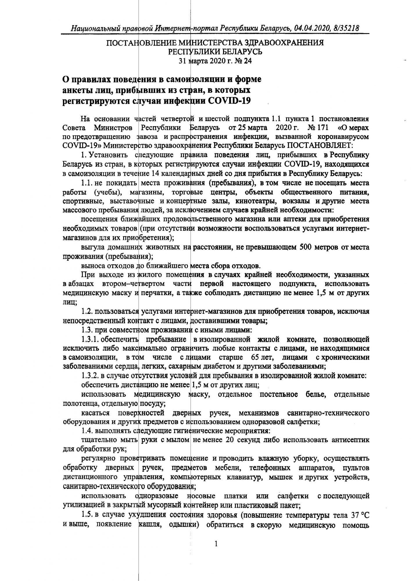 Утверждена инструкция о порядке взаимодействия органов государственного управления и иных организаций по обеспечению соблюдения мер самоизоляции лицами, прибывшими в Беларусь из стран, в которых регистрируются случаи инфекции COVID-19. Это предусмотрено постановлением Минздрава, МВД и Госпогранкомитета от 2 апреля №27/73/4, которое 5 апреля опубликовано на Национальном правовом интернет-портале.