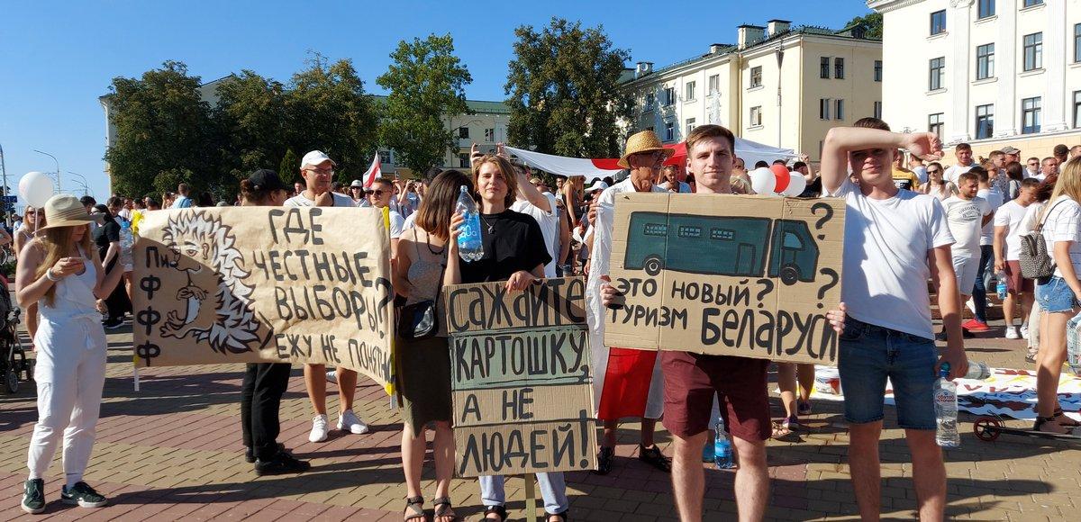 Протестующие то и дело кричат: «Жыве Беларусь!», «Уходи», «Дай дорогу!», «Выпускай Юру!».