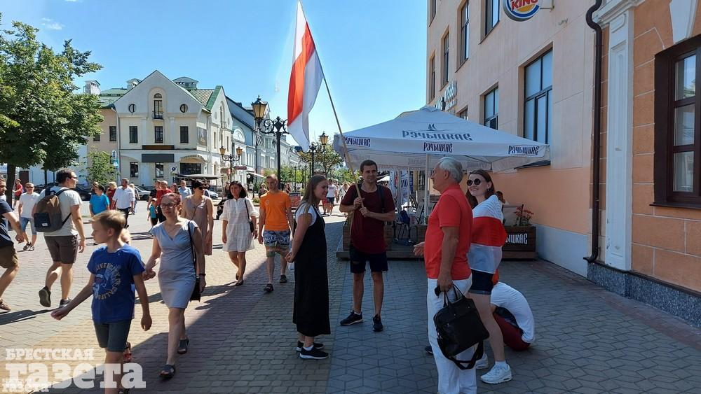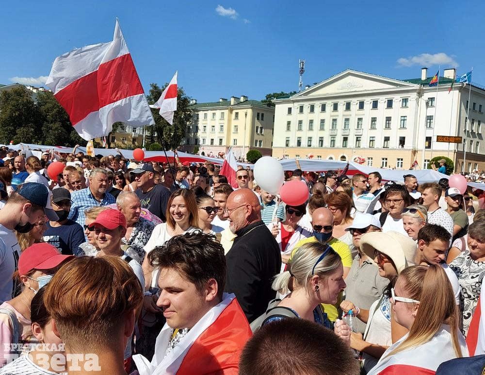 Брестчане растянули бело-красно-белый флаг длиной в 100 метров. Люди все еще подтягиваются к площади.