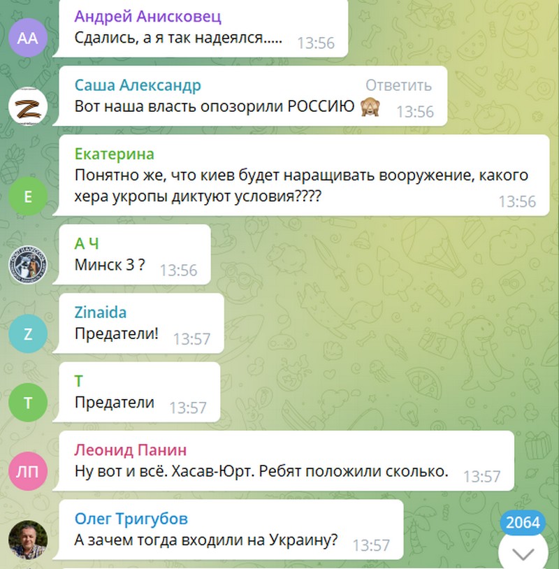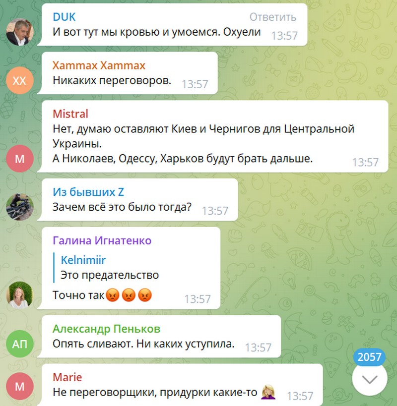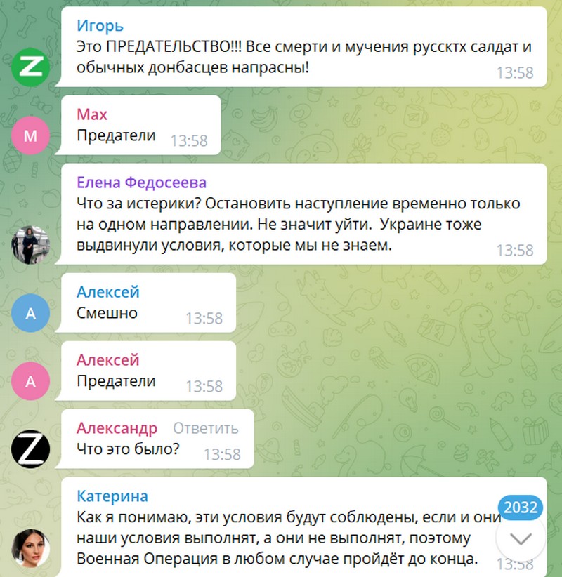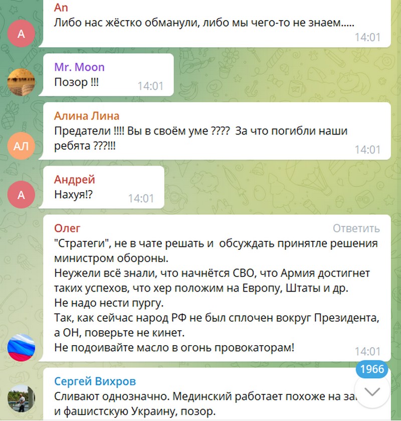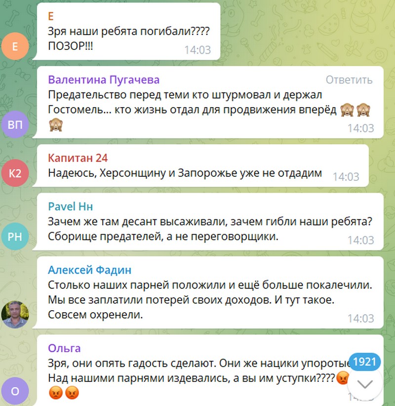 Вы поймите!!! Никто не сливает!!! В Киеве огромное количество мирных граждан! Мы же не ВАРВАРЫ! Поймите! Никто не останавливает спецоперацию! Начните анализировать! Ведь и с нашей стороны глупо будут гибнуть! Не пишите о предательстве. АНАЛИЗИРУЙТЕ ИНФОРМАЦИЮ!
