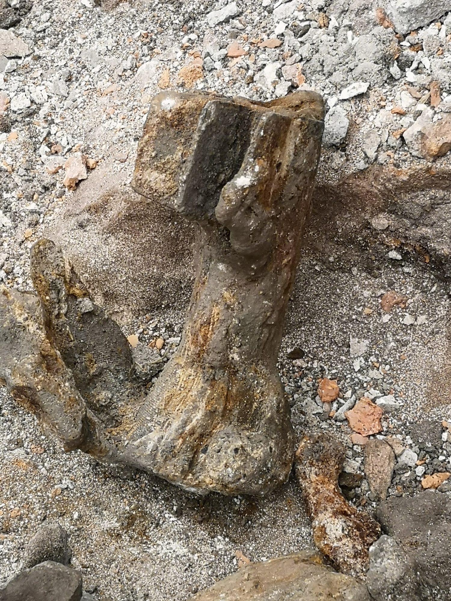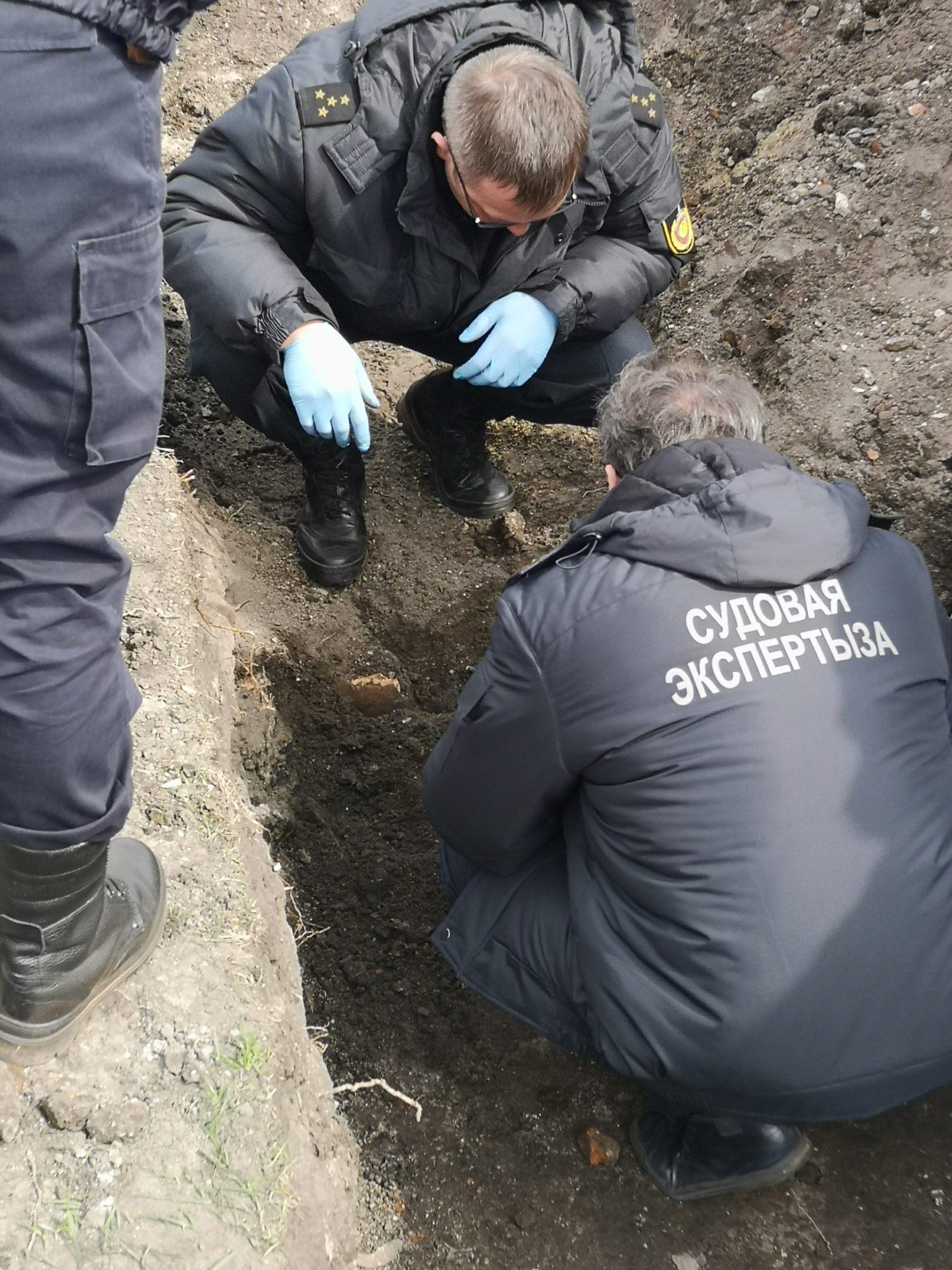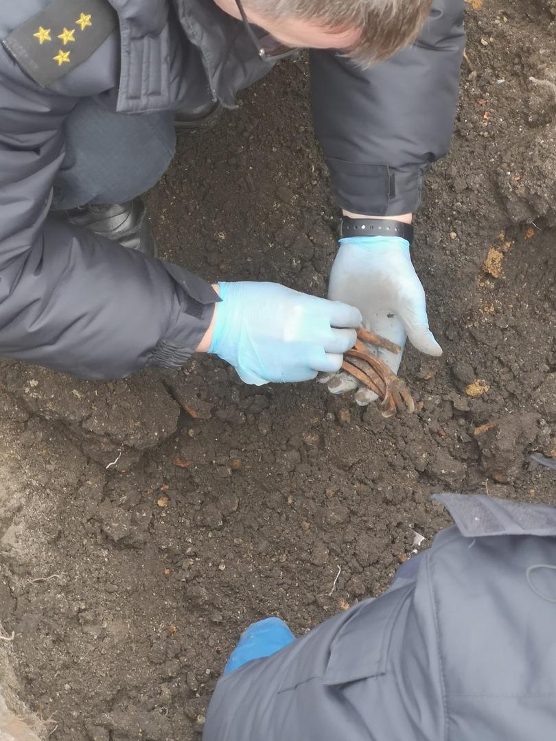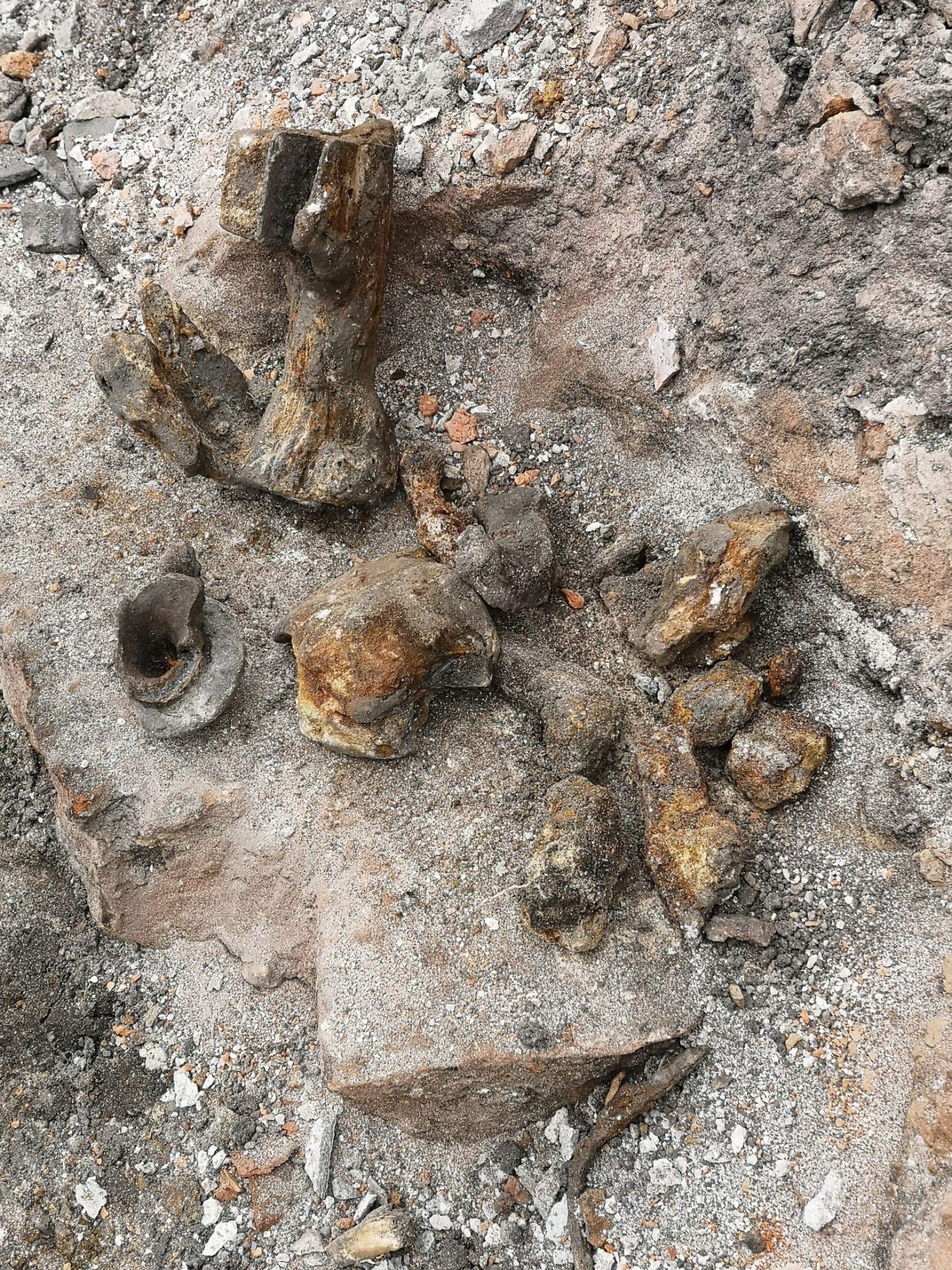 Рядом с этой находкой были обнаружены кости животных, хвостовая часть мины и осколки снарядов.