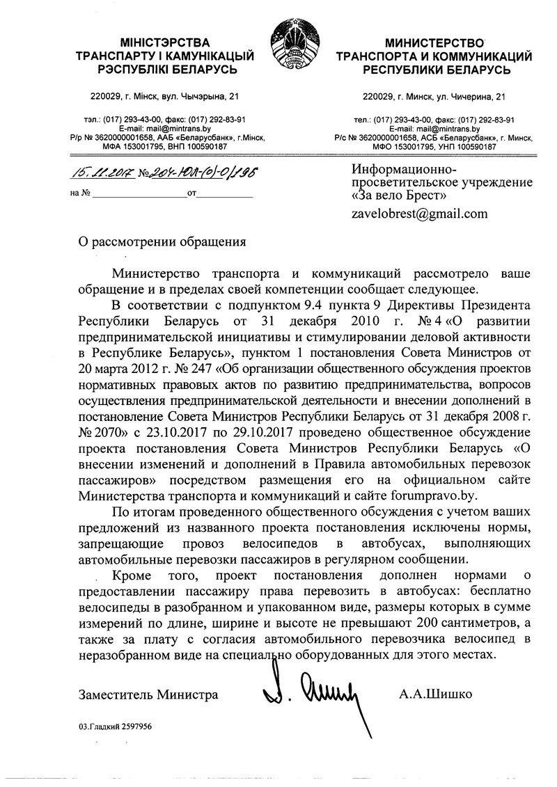 Минтранс пошел на уступки брестским велоактивистам. В ответе ведомства на обращение «За вело-Брест» сообщается: «По итогам проведенного общественного обсуждения с учетом ваших предложений из названного проекта постановления исключены нормы, запрещающие провоз велосипедов в автобусах, выполняющих автомобильные перевозки пассажиров в регулярном сообщении».