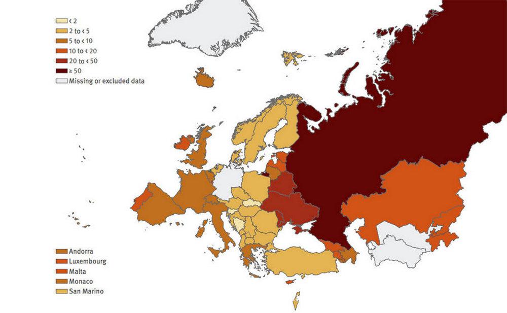Самая высокая частота заражений — в России, 71 случай на 100 тыс. Ненамного ниже оказались показатели Украины и Беларуси — 37 и 26,1 соответственно. Самые низкие показатели были выявлены в Боснии и Герцеговине (0,3), Словакии (1,6) и Словении (1,9). На Россию и Украину приходится 75% заражений ВИЧ в Европейском регионе ВОЗ и 92% заражений в Восточной Европе, подчеркивается в докладе.