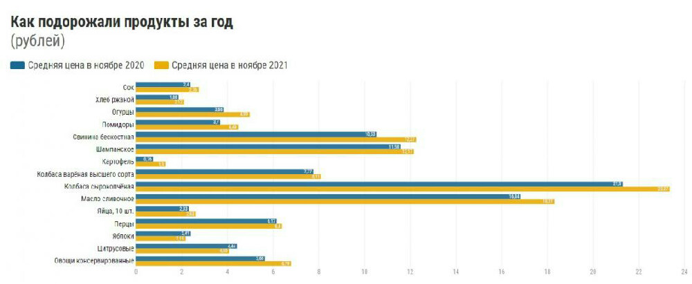 Получилось, что наши продукты за это время подорожали на 10,19%, что немного ниже ноябрьской инфляции, которая составила 10,3%.