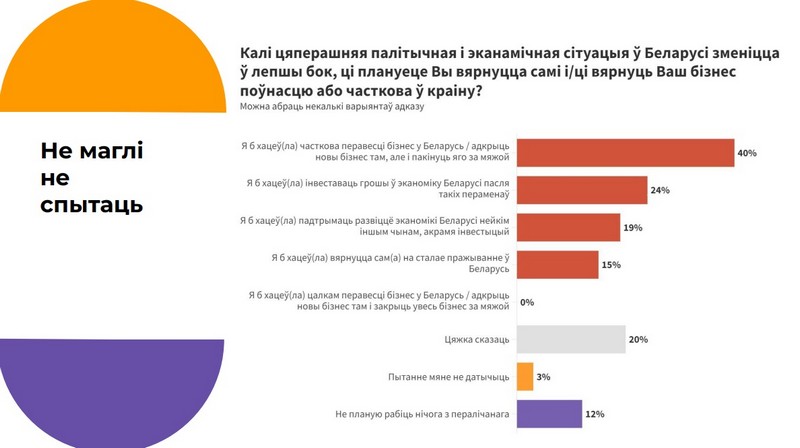 Также у участников спросили, хотят ли они сами вернуться в Беларусь после политических и экономических изменений, а еще — готовы ли перевозить в нашу страну свои фирмы. Только 15% ответили, что хотят вернуться в Беларусь. 40% опрошенных владельцев таких фирм заявили, что хотели бы сохранить сегодняшний европейский бизнес, но параллельно начать свое дело в нашей стране.