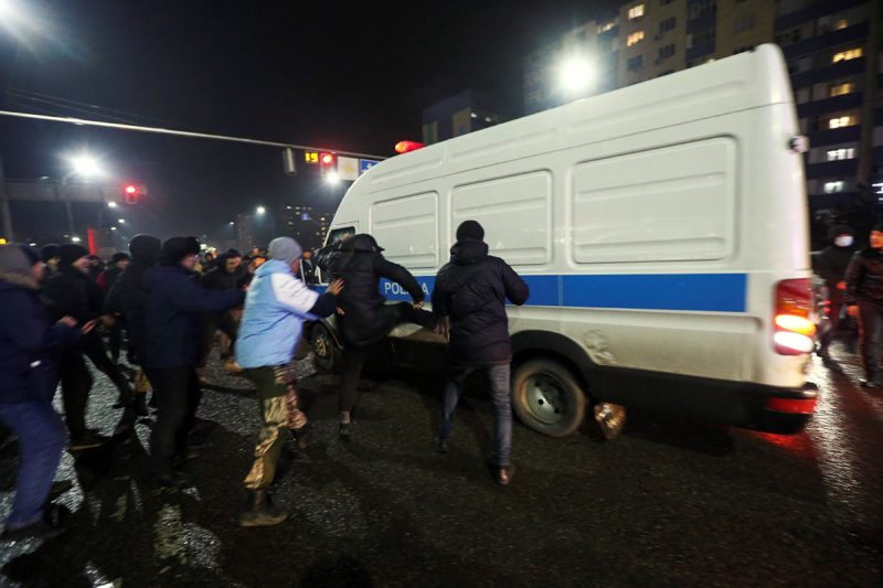 В целом участники демонстраций в Алматы ведут себя агрессивно: они избивают силовиков, поджигают машины, бьют витрины магазинов. В других городах протесты гораздо более мирные. Например, некоторые силовики в Атырау и Актау переходят на сторону демонстрантов, а в Актобе полицейские отказались задерживать протестующих.