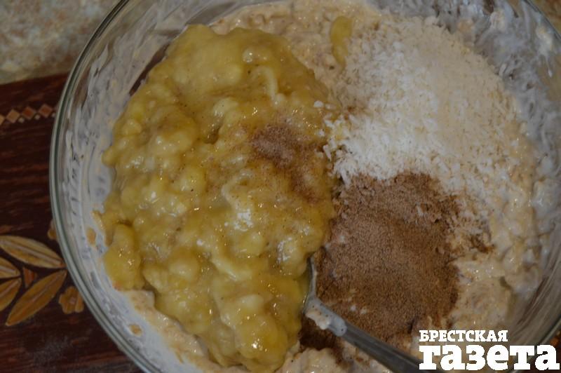 3.Соедините размокшие хлопья с банановым пюре, добавьте кокосовую стружку, корицу, ванилин и сахар по вкусу.