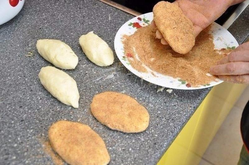 Готовим: Очищенный картофель отварите, воду слейте, подсушите и разомните. Пюре слегка охладите, добавить 50 г сливочного масла, 2 яичных желтка и муку. Тщательно перемешайте и сделайте котлеты. Обваляйте их в сухарях и обжарьте с обеих сторон.
