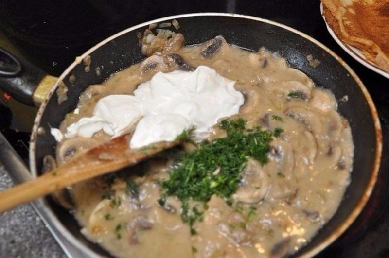 На другой сковороде муку и оставшееся сливочное масло прогрейте при постоянном помешивании до светло-желтого цвета и получившуюся массу переложите в сковороду с грибами. Посолите, поперчите по вкусу и перемешайте. Дайте повариться соусу около 10 минут на медленном огне. В самом конце положите сметану, доведите до кипения и выключите.