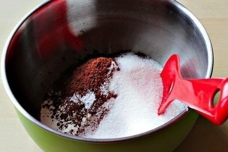 Готовим: Соедините муку, соду, какао, сахар и соль. Добавьте растительное масло, ваниль и молоко и хорошо перемешайте.