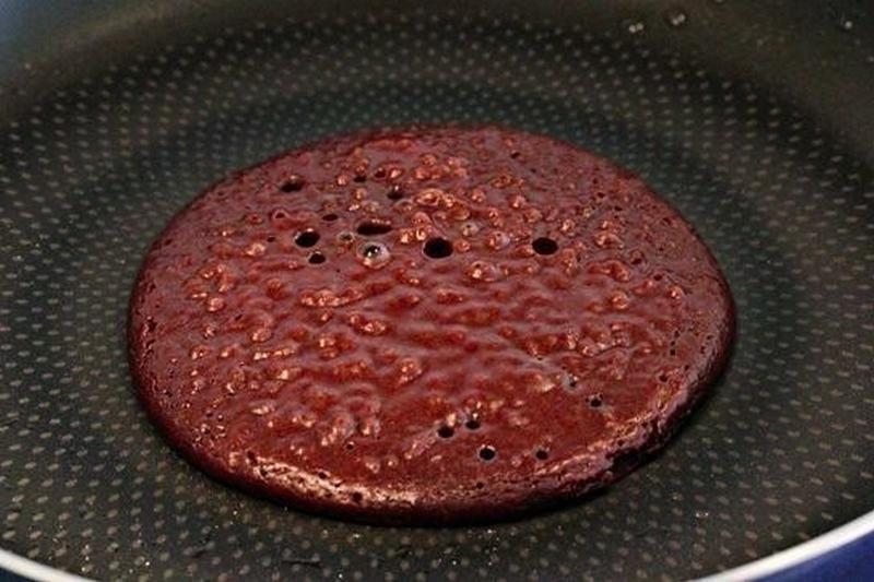 Нагрейте сковороду, смажьте жиром или маслом и вылейте в центр около четверти стакана теста. Когда появятся пузырьки, переверните блинчик.