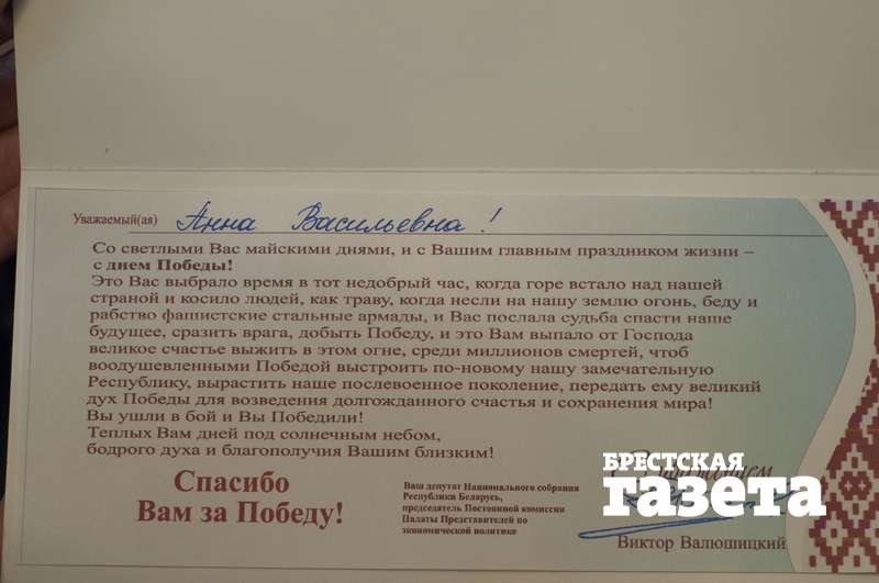 В этом году с Днем Победы Анну Васильевну поздравил открыткой только Виктор Валюшицкий, депутат Национального собрания Республики Беларусь. Открытка пришла по почте.
