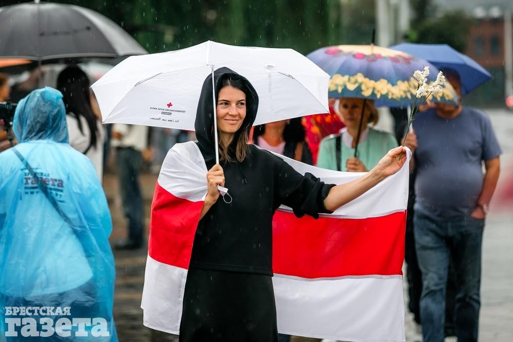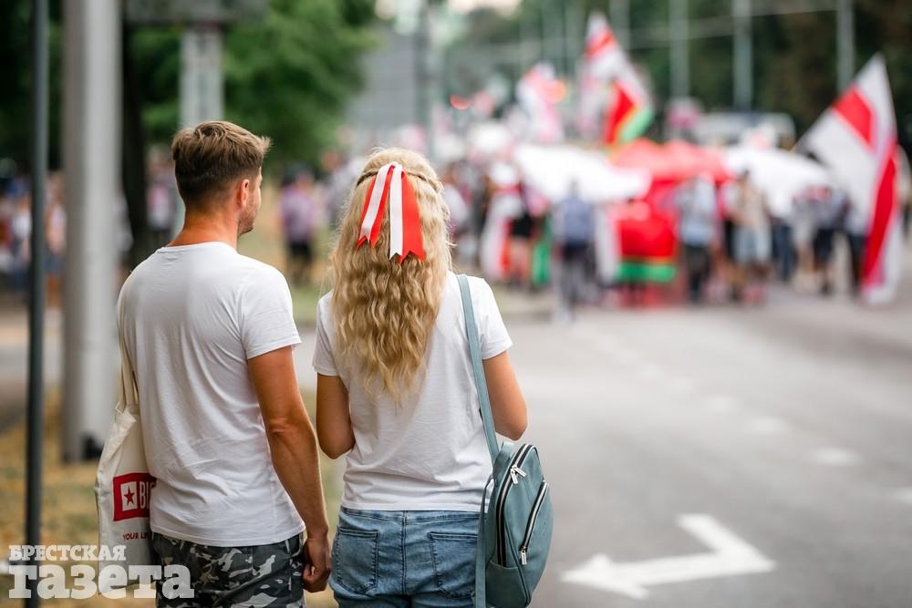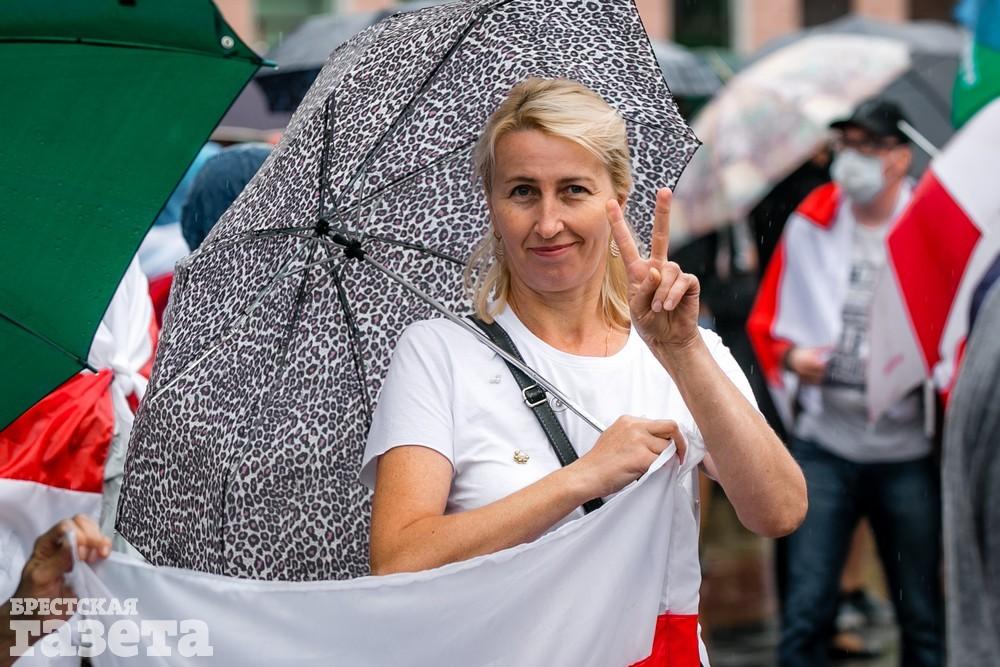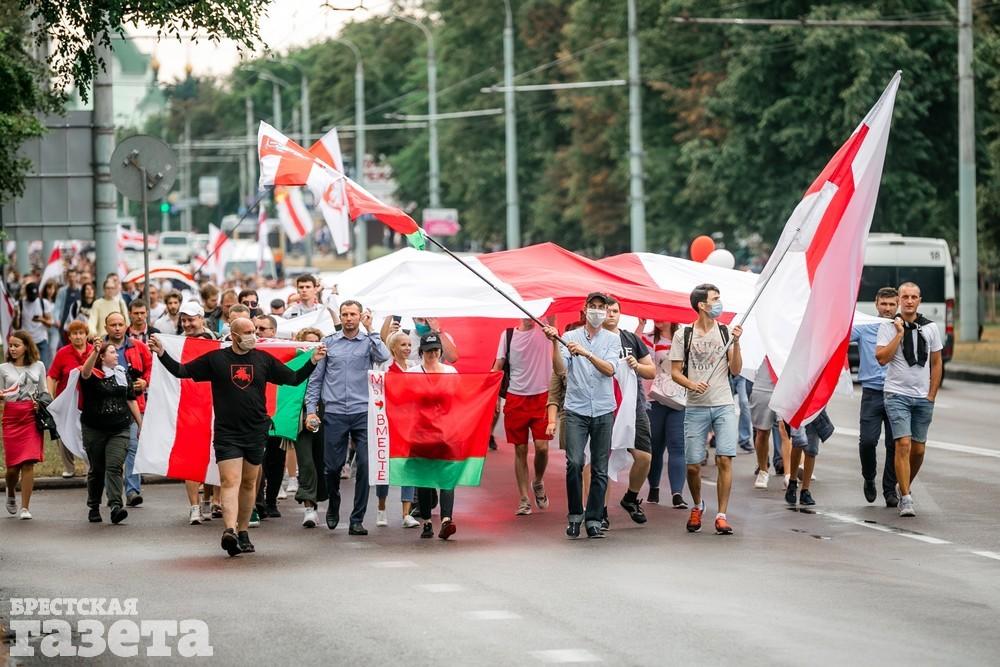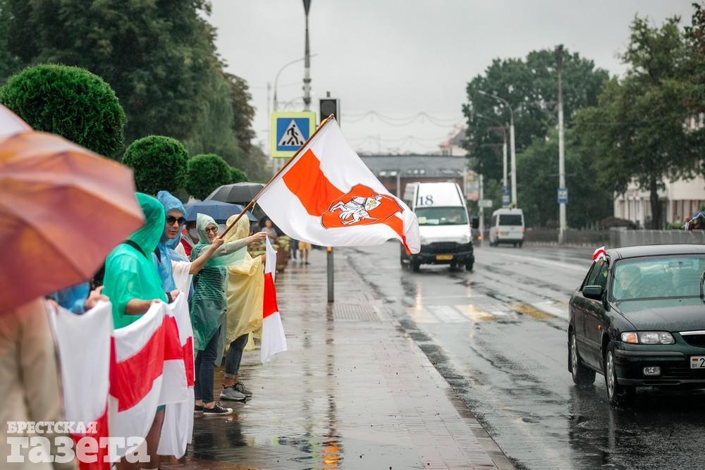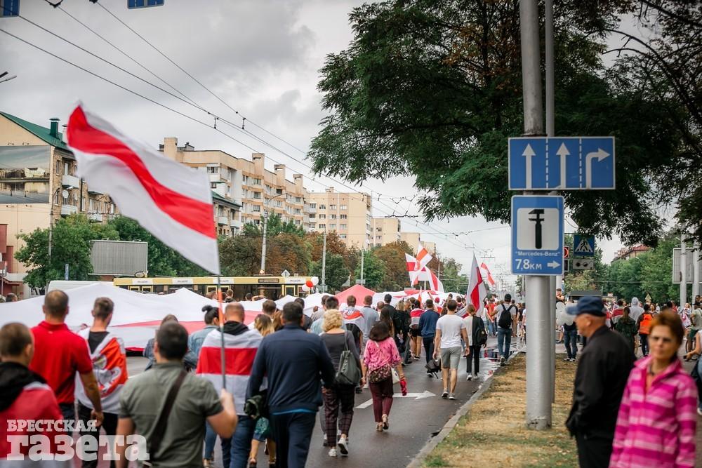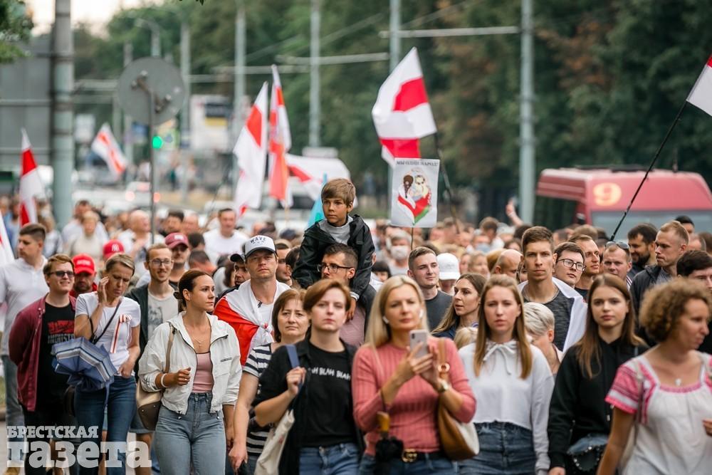 В Бресте эпицентром мирной акции протеста стала площадь Ленина. Собравшиеся люди с цветами, шариками, плакатами и бело-красно-белыми флагами периодически скандировали «Жыве Беларусь!», «Верым! Можам! Пераможам!» Проезжающие машины поддерживали их сигналами.