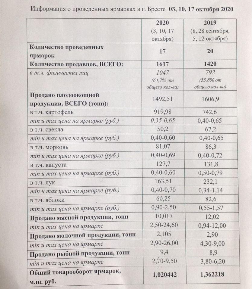 После выходных глава Бреста Александр Рогачук поделился информацией по итогам сельскохозяйственных ярмарок, прошедших в Бресте 3, 10 и 17 октября. Согласно этим данным, картофель стоит от 35 до 65 копеек, свекла – от 40 до 60 копеек, морковь – от 40 до 69, капуста – от 40 до 60, лук – от 40 до 70, яблоки – от 90 копеек до 2,50 рубля. Минимальная и максимальная цены мясной продукции на ярмарке – 2,50 и 24,60 рубля, молочной – 2,90 и 26 рублей, рыбной продукции – 2,70 и 9,50 рубля.