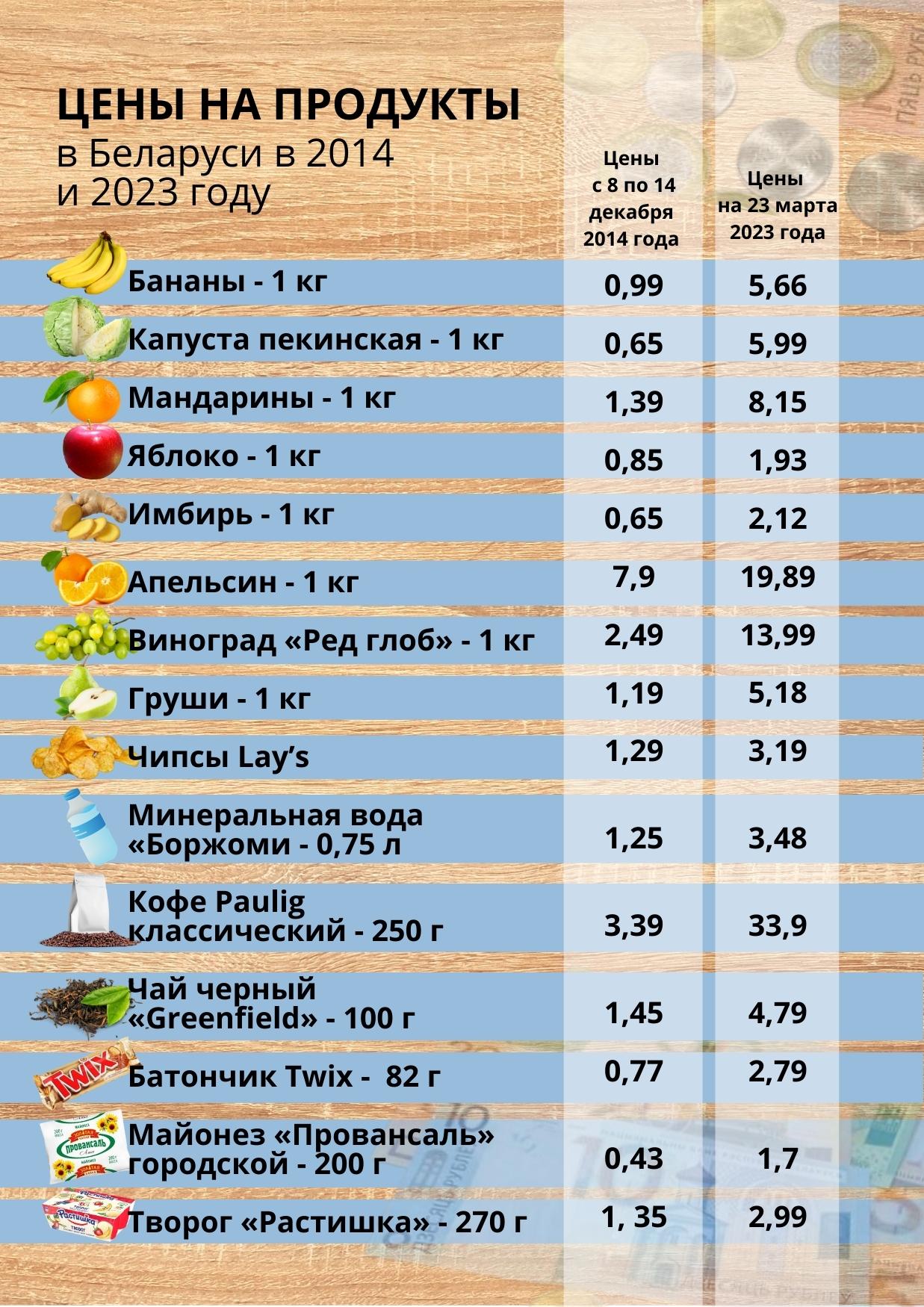 В инфографике ниже мы в табличном формате сравнили цены в «Евроопте» за декабрь 2014 года, с ценами «Е-доставки» на 23 марта 2023 года. Следует отметить, что стоимость товаров в один день может отличаться в «Евроопте» и «Е-доставке». Но даже не смотря на это, уровень разбежки ценников в 2014-м и 2023-м годах огромный.