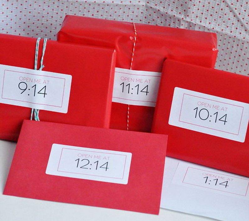 Упакуйте каждый подарок в отдельную коробку или конверт. Оберните одинаковой бумагой или тканью и приклейте табличку, где будет указано время, когда нужно открыть подарок. Также можно на первой табличке написать, где можно найти следующий подарок, и так по цепочке. Хорошее настроение на весь день вашему мужчине обеспечено.