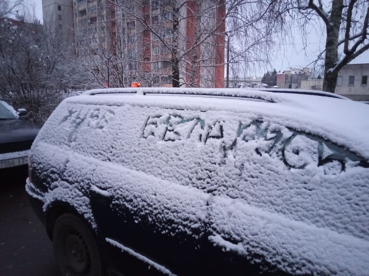 В Бресте ночью выпал первый снег, который пока держится. И креативные сторонники перемен тут же этим воспользовались.