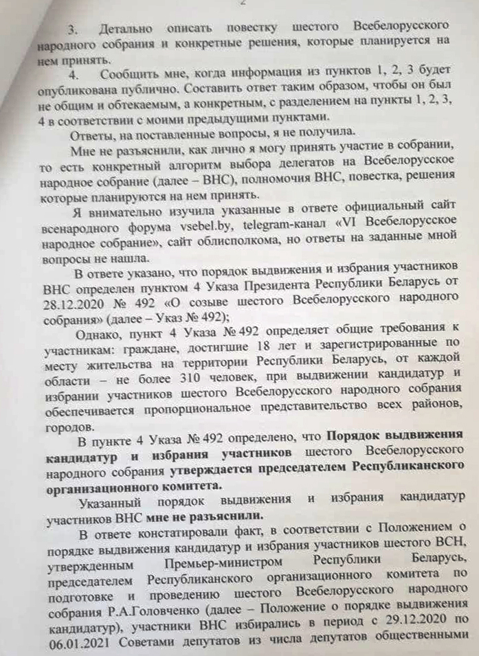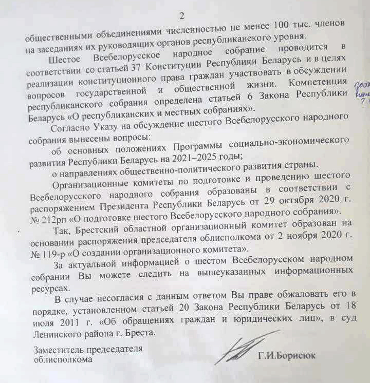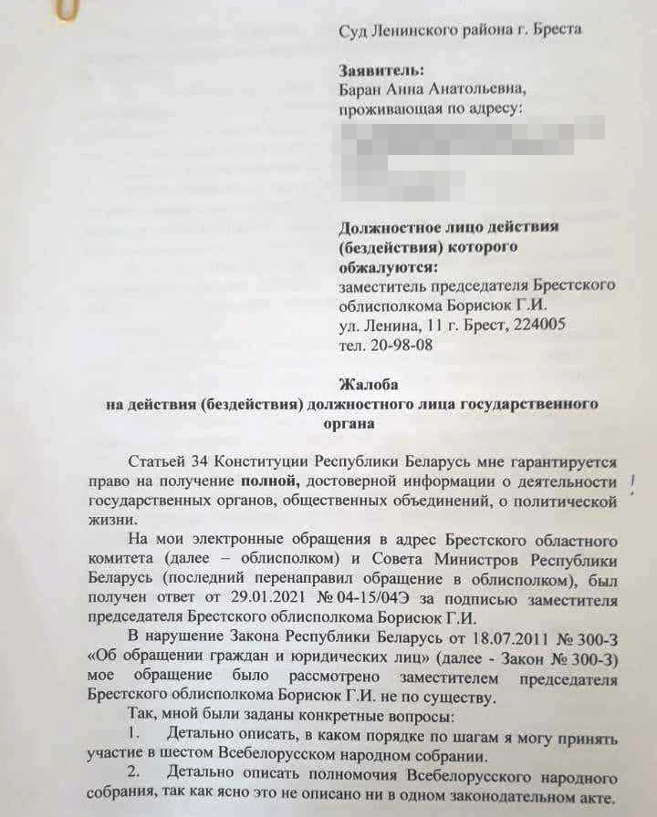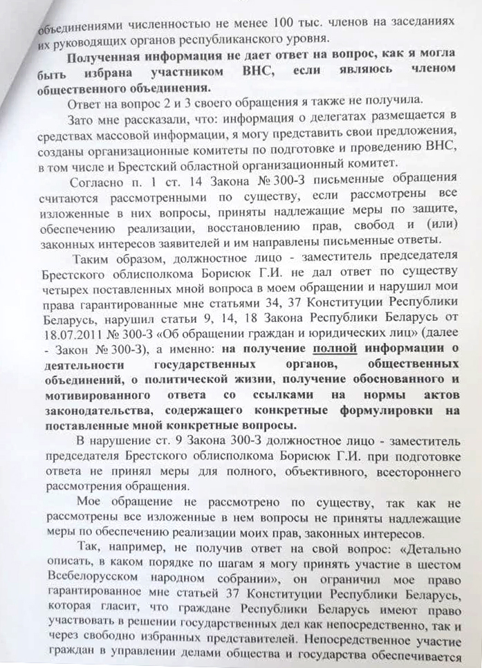 В жалобе Анны на действия (бездействия) должностного лица говорится, что в январе 2021 года она отправляла электронные обращения на адрес Брестского облисполкома и Совета министров (спустил на облисполком – прим. ред.), чтобы ей пошагово объяснили, как образом она может принять участие в шестом ВНС, детально описать полномочия собрания, «так как ясно это не описано ни в одном законодательном акте», детально описать повестку шестого ВНС и конкретные решения, которые планируется на нем принять. В ответе, который пришел за подписью заместителя председателя облисполкома Геннадия Борисюка, по мнению заявительницы, нет ответов по существу. По ее мнению, чиновник формально отнесся к ее обращению и ограничил ее право на получение полной, достоверной информации о деятельности государственных органов, общественных объединений, политической жизни.