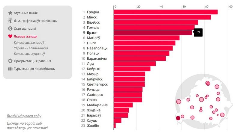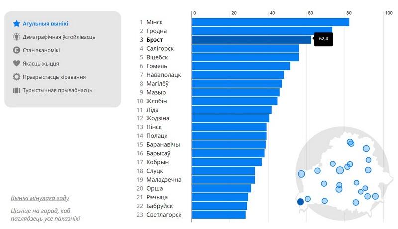 Однако по совокупности всех показателей лучшим белорусским городом эксперты признали Минск (он набрал 82,2 балла). Вторая строчка у Гродно (73,4 балла). Замыкает тройку лидеров Брест с 62,4 балла.