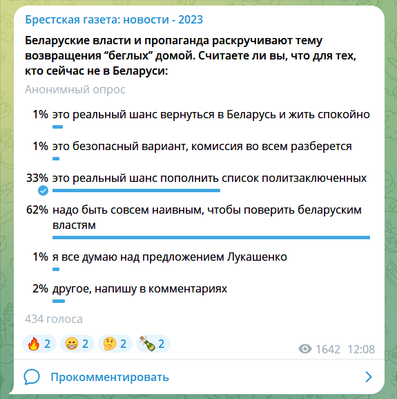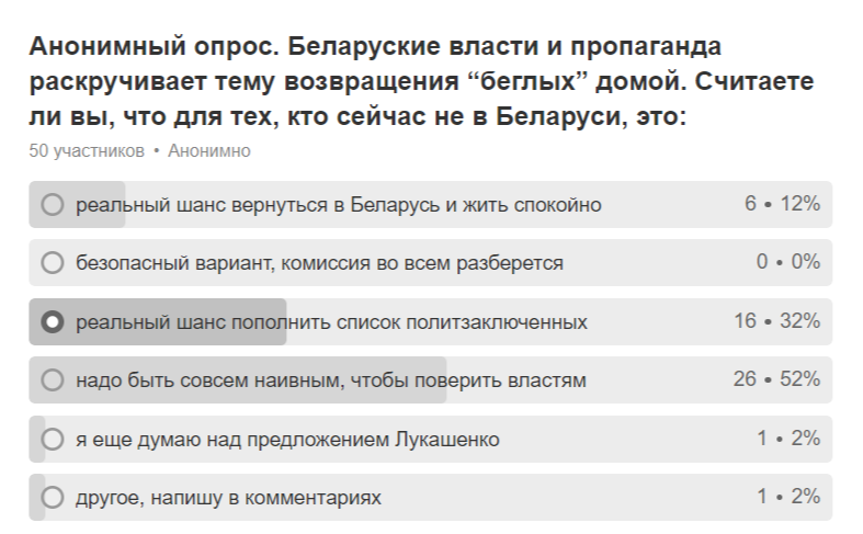 Читатели «БГ» ответили на вопрос о возможности для «беглых» вернуться и жить спокойно в Беларуси. В искренность властей, зовущих на родину, не верит почти никто. 95% поучаствовавших в опросе в нашем телеграм-канале фактически считают это ловушкой.