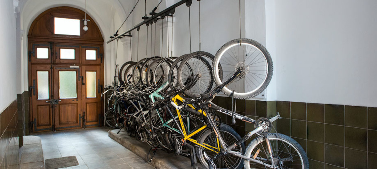 В домах современных проектов предусмотрены колясочные, где можно оставить коляску или велосипед ребенка. Также встречаются дома с помещениями или парковками для велосипедов. Там можно оставить велосипед, не поднимая его на этаж.