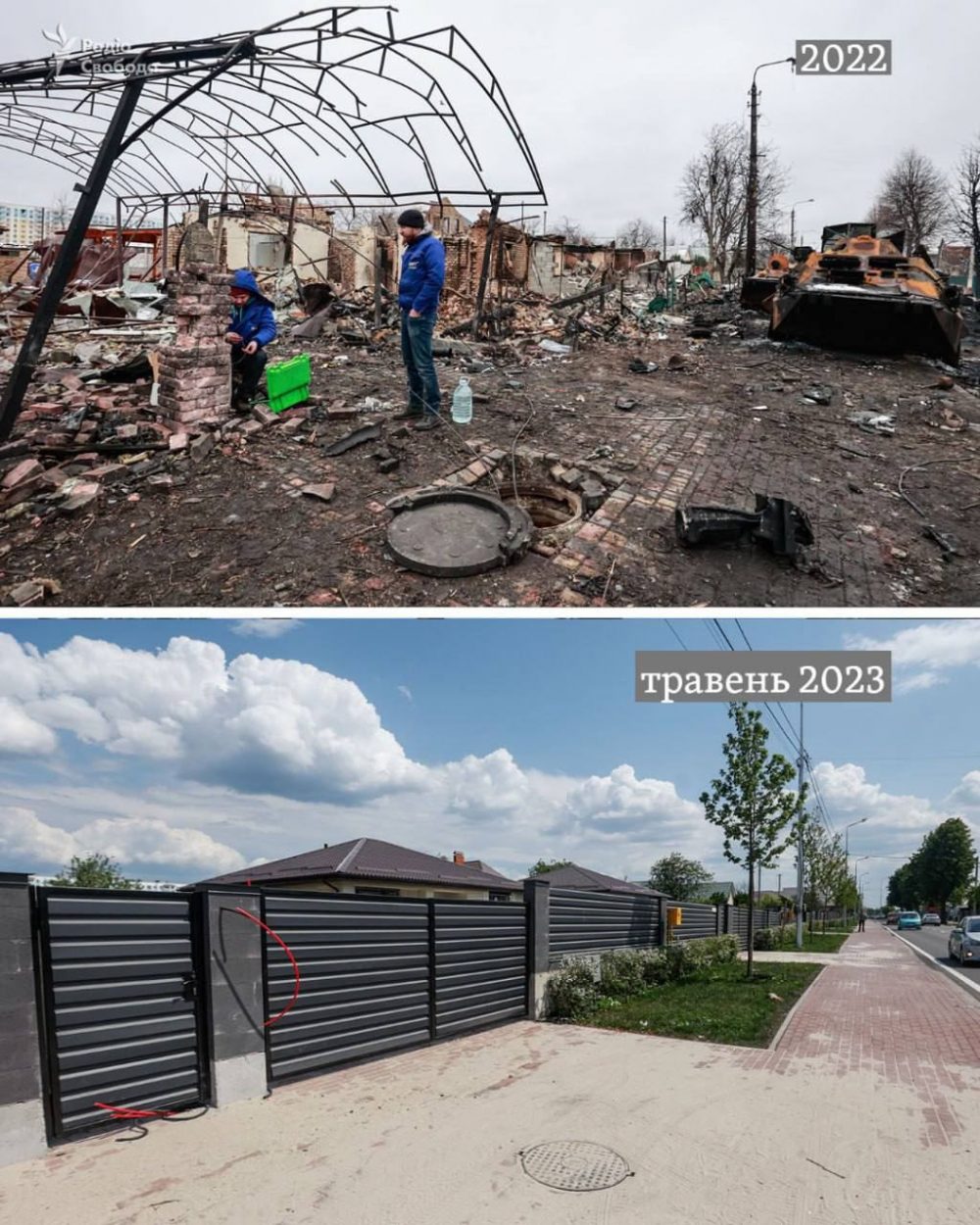 За год Вокзальную не узнать – американская некоммерческая организация Global Empowerment Mission (GEM) совместно с партнерами и властями отремонтировали 110 домов. Около 20 из них требовали более значительных ремонтных работ. Практически повсюду пришлось восстанавливать окна и крыши. И самое главное – 12 полностью разрушенных домов были отстроены с нуля.Улица Вокзальная и сожженная техника русской армии, город Буча, Киевская область, 1 марта 2022 года. То же место – май 2023 года.Кроме того, в результате активных боевых действий российские войска разрушили и большинство инфраструктуры: электроопоры, коммуникации, дорожное покрытие – все это также отстроили благотворители совместно с городскими властями.Местные жители Наталья и Рустем: «Дом цел, но то, что кирпичик к кирпичику сам выкладывал, сам составлял, – на старости лет решили, чтобы жить легче было. Видите, как произошло – теперь начинать сначала? Очень тяжело, очень страшно было сидеть в подвале, как все грохотало. Думали, у нас самая безопасная зона. А видите, как вышло». Город Буча, Киевская область, 1 марта 2022 года.