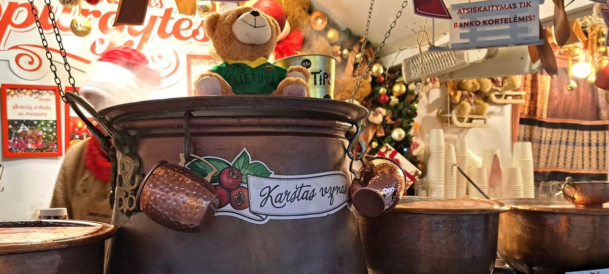 На входе, как водится, — павильоны с горячими напитками. Кроме традиционного глинтвейна, в Литве популярен клюквенный кисель. Его готовят из давленой клюквы и воды с добавлением небольшого количества крахмала. Подают горячим и холодным. Этот же напиток продается в супермаркетах, но распробовать его как следует можно как раз на рождественской ярмарке.
